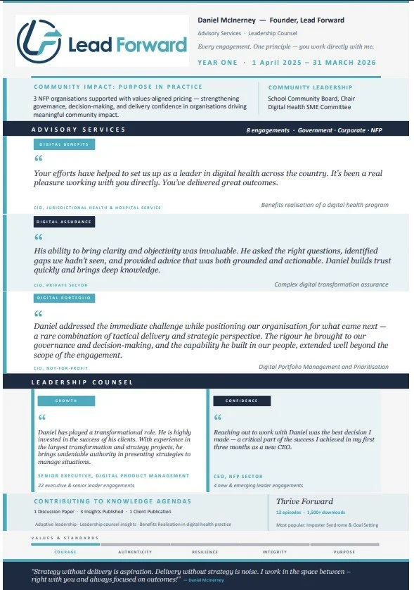 Lead Forward is built on the values of transparency, accountability, and purpose. Publishing our yearly Impact Report is a reflection of those values — an honest account of the work we have done, the clients we have served, and the impact we have delivered.